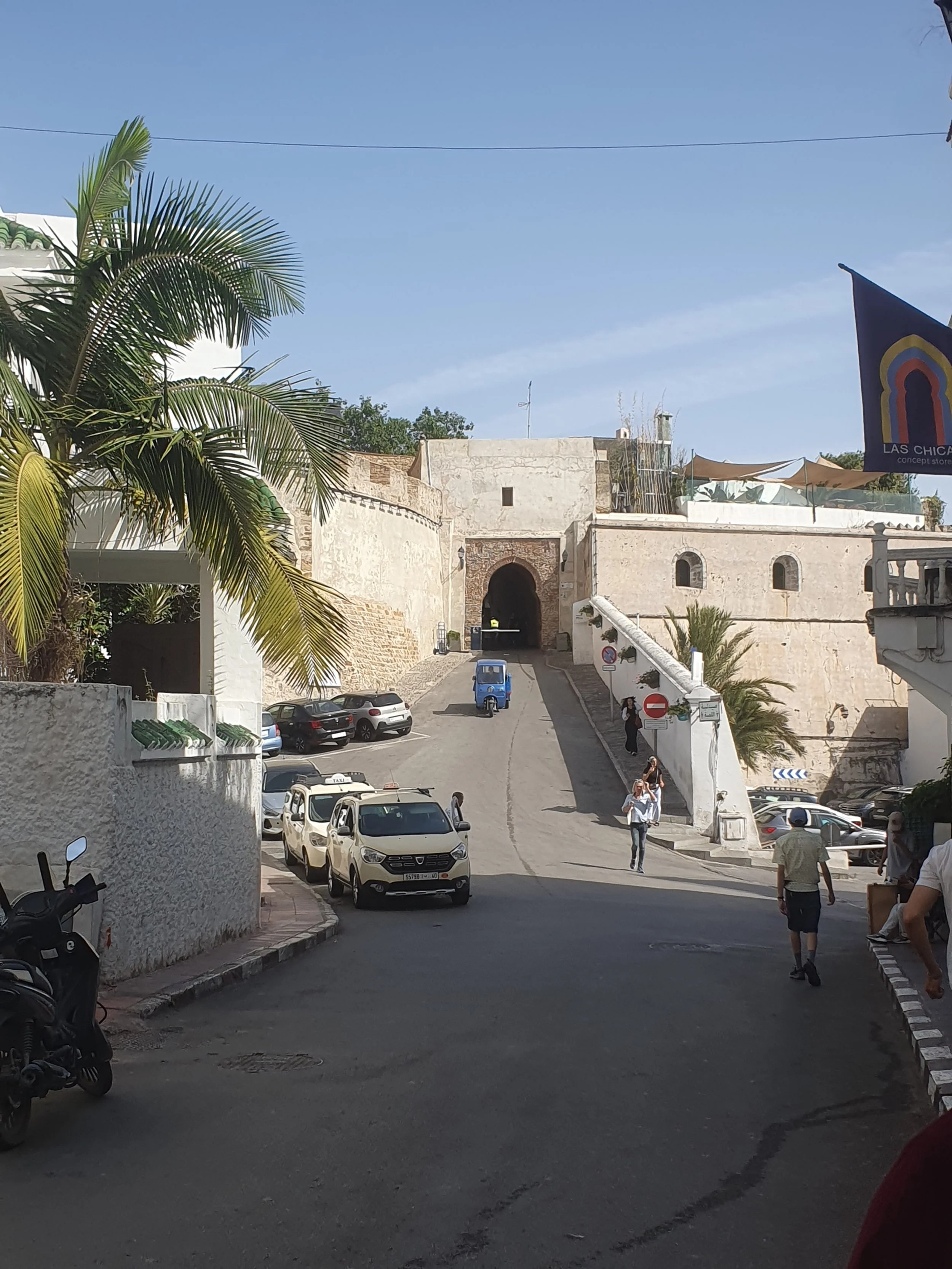 A view of Bab Kasbah - the Kasbah Gate - leading into the medina at the top. The steep street down to Grand Socco is on the right.