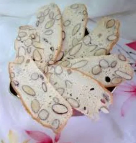 It is a twice baked biscuit. That is, the first cooking is a slow bake – predominantly egg whites like meringue with a lot of flour, plus lots of dried fruit and/or nuts and seeds. I loved the dried apricots, glace cherries and almonds or walnuts, and also the one loaded with sunflower and sesame seeds and caraway seeds (and less sugar). For the second, you cut the loaf into ¼ inch ½ cm slices and bake again til browned.