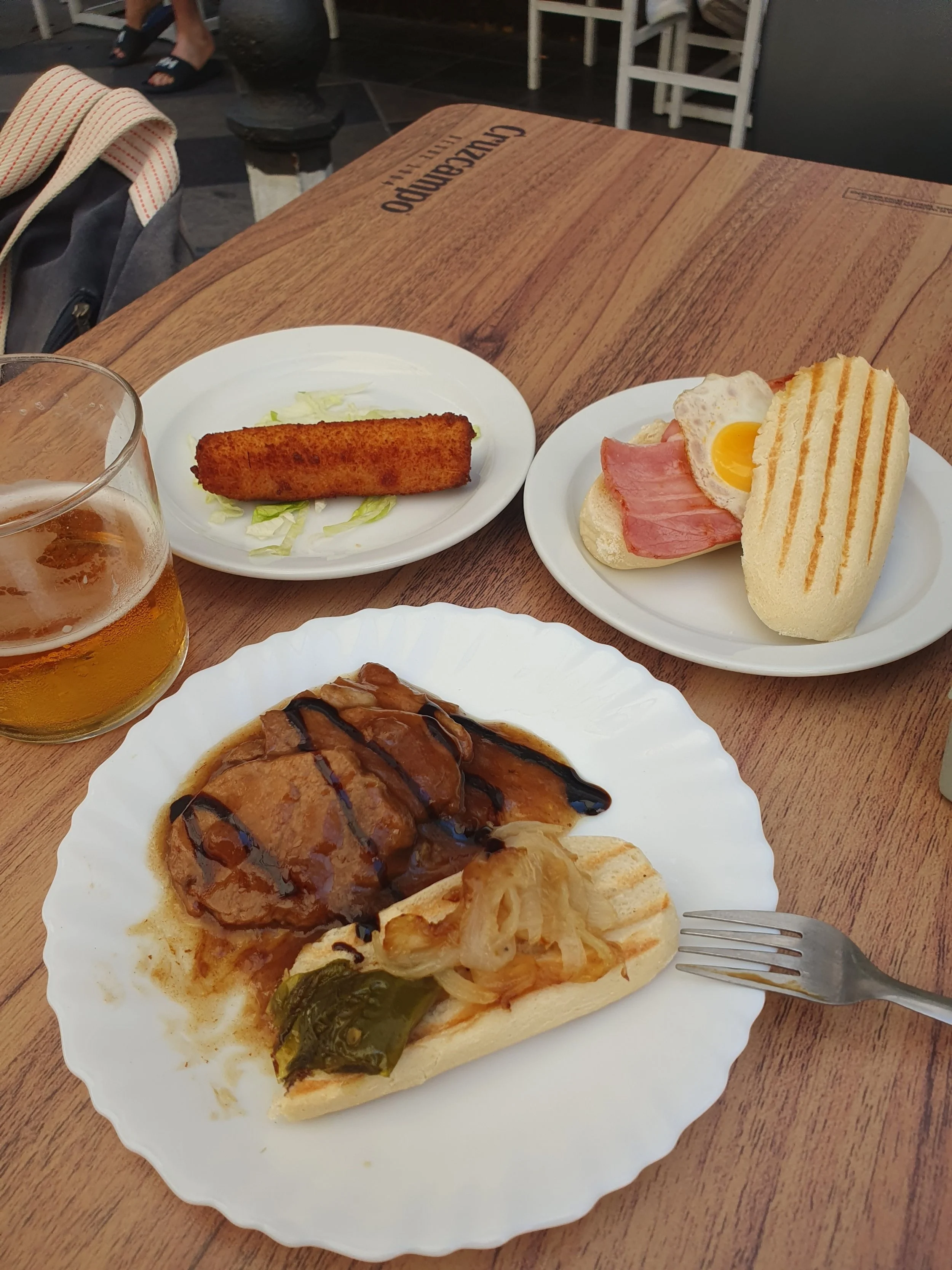 We start early by meeting their friends for breakfast. This is a treat in Spain. While a Spanish breakfast is typically tomato-mash on toast, it is also common to have a sandwich with thickly sliced bread. These are small, and cheap, and always work with coffee.