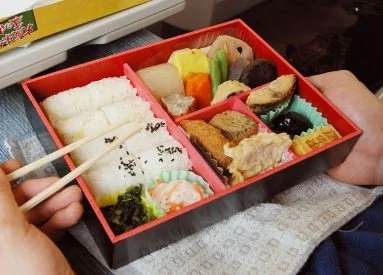 An ekiben - station obento lunchbox. There is a really serious problem when it comes to choosing which one - any sizeable station has dozens of tasty looking choices.