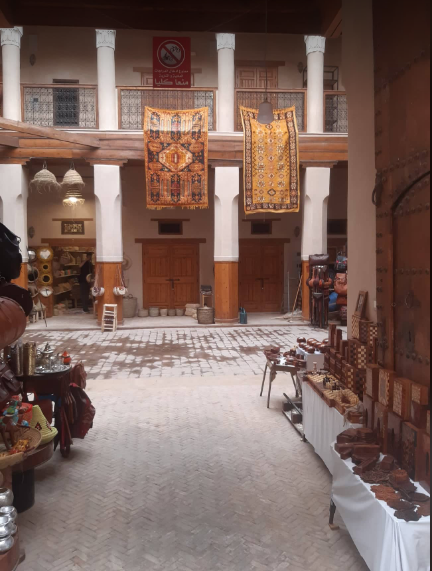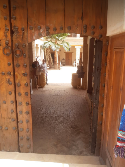 A foundouk is a grand courtyard ringed with a two storey columned balcony. The massive wooden gate, which can be studded or carved, is big enough to allow through the camels and all their various sizes of carts and baggage.