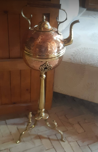 Freestanding copper kettle, the bottom half is a brazier for the coals to keep it hot.