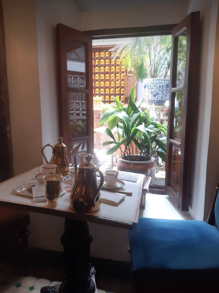 The coffee comes in shining and elegant brass pots with whipped cream and delicate crystalised coffee sugar. The waiter pours from the long serpentine spouts with the same flourish as our breakfast tea, and we sit in the most glorious café-garden-courtyard for a sublime retreat from the chaos of Marrakech.
