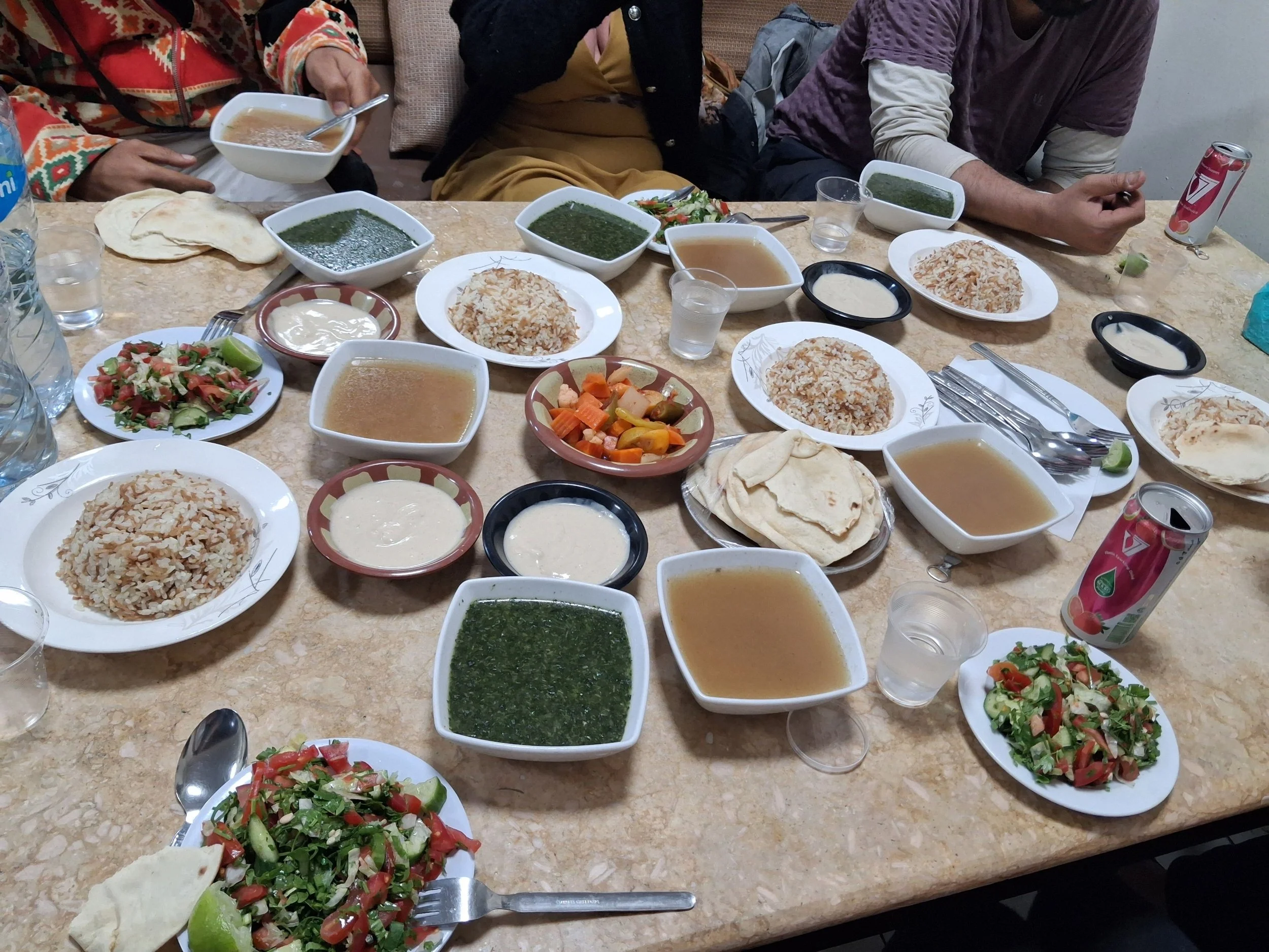 We are still waiting for the food to arrive… This is just preliminaries. Yes, more than just me, but still for only four people. The BBQ chicken halves and quarters are still on the way. Each person has a salad, dish of tahini, pasta soup, Levant rice, and Mouloqia (green herb sauce), with bread and pickles for everyone.